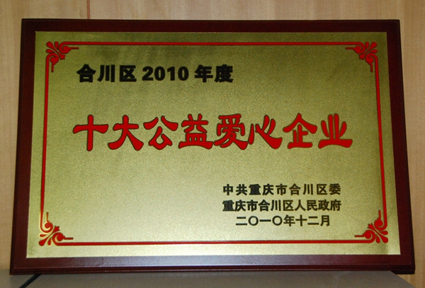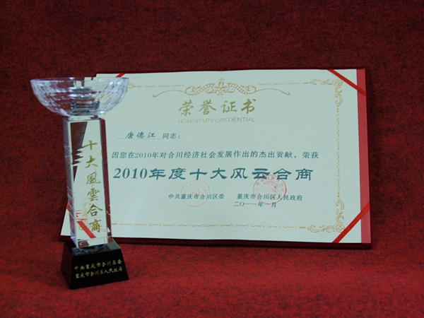 2011年1月30日,2010年度“十大风云合商”暨德润合川颁奖盛典在合川区艺术中心隆重举行。我公司荣获合川“十大爱心企业”奖,公司董事长唐德江荣获德润合川“十大风云合商”奖。此举是为了表彰我公司对德润合川事业所作出的突出贡献。