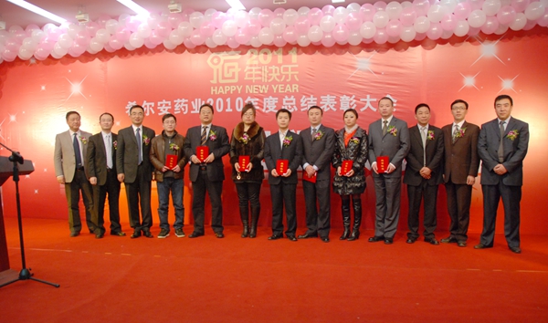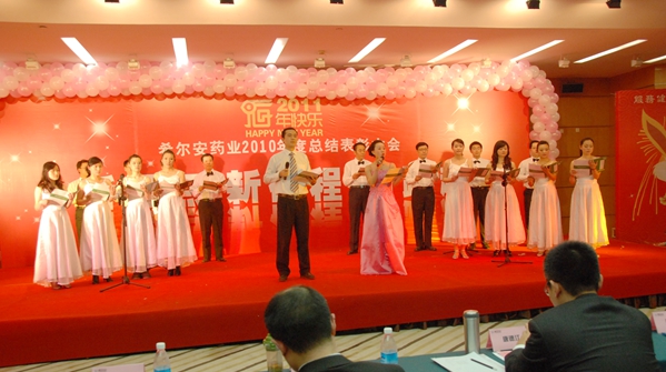 舞台搭起来,气球飘起来,红红的中国结挂起来。2011年1月25日,重庆国际会展中心一楼多功能厅张灯结彩、喜气洋洋,400多名希尔安药业员工从四面八方汇聚在一起,欢欢喜喜过大年,希尔安药业2010年度总结表彰大会隆重召开。