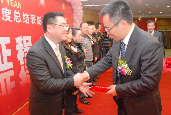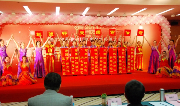 全体入座后,会议正式开始。公司党委副书记、副总经理赵晓荒主持会议。会议第一项,由公司党委书记、总经理陈犁作年度工作报告。陈总系统地总结了2010年公司取得的各项成就,存在的问题和不足,提出了明年的工作思路和工作重点(下文将摘选刊发部分总经理报告内容)。随后,公司对先进进行表彰。在雄壮的进行曲中,公司董事长唐德江、总经理陈犁,副总经理邹茂强、张晓伟、张玮、王迪根提前站在了台口,迎接上台领奖的先进,并依次与每位先进握手、祝贺,最后礼仪小姐端出获奖证书,公司领导向获奖的先进集体、先进工作组、技术创新奖的代表及先进个人隆重颁奖并合影留念。蓝作海、施冶、陶勇、吕姗珊、曾信容五位先进个人作为获奖的先进代表在大会上发言。最后,董事长唐德江作总结性讲话,唐董首先概括地总结了2010年公司取得的成就,接着重点阐述了2011年公司的四大重点工作和明年的销售目标,并号召全体员工要有“等不起”的紧迫感,“低不下”的目标感,“弱不得”的危机感,满怀豪情冲向我们宏伟的目标。