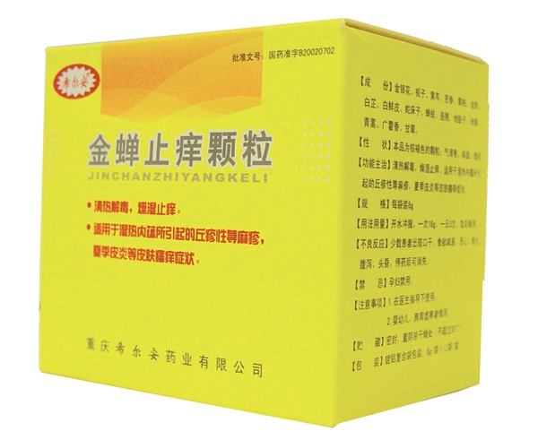 金蝉止痒胶囊为我公司拳头产品,是在经典名方“龙胆泄肝汤”和“消风散”基础上组方而成,其主要成分为金银花、栀子、黄芩、苦参、黄柏、龙胆草、白芷、白鲜皮等16味中药。全方清热解毒、燥湿止痒,兼有凉血祛风之效,适用于湿热内蕴所引起的过敏性皮肤病。
