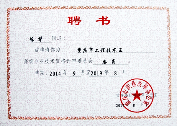 又讯 近日,公司总经理陈犁被重庆市职称改革办公室聘为重庆市工程技术正高级专业技术评审委员会委员。