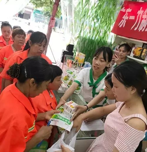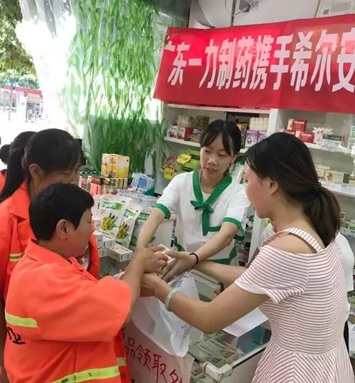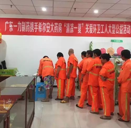 这是2017年7月15日,希尔安大药房的合川江上城店和上什字店,希尔安大药房携手广东一力制药组织开展“清凉一夏”关爱环卫工人公益活动时感人的一幕。