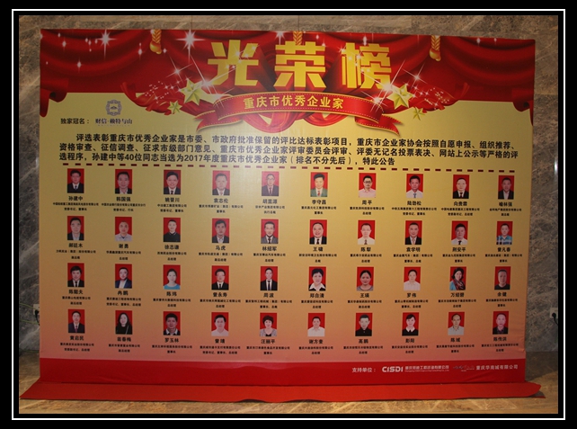 为发挥优秀企业家标杆引领作用,重庆市企业联合会在市经信息委、市商务委、市人力社保局、市民政局、市总工会、市工商联等部门的指导和支持下,组织开展了重庆市优秀企业家评选工作。本次优秀企业家评选遵循依法、公开、公平、公正、合理的原则,按照自愿申报、组织推荐、资格审查、征信调查、市级部门认可,经“重庆市优秀企业家评审委员会”全体评委审议,并采用无记名投票、网站上公示等严格的评选程序,历时9个月时间,最终产生本次获奖的40名优秀企业家。
