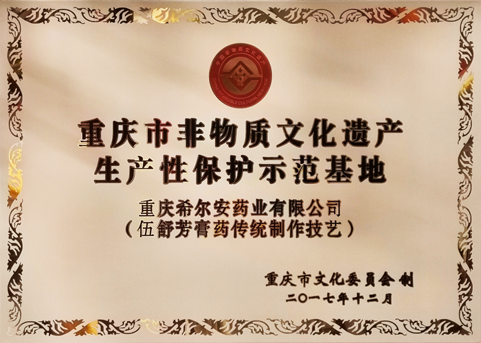 2016年6月,我司“伍舒芳膏药传统制作技艺”正式入选重庆市非物质文化遗产代表性项目名录。“伍舒芳”起源于康熙三十七年(公元1698年)渝中区太平门,至今已有300多年的历史,是重庆现存于世历史悠久的老字号。其膏药产品配方独特,用药精良,疗效奇佳,受到官方推崇、百姓追捧,几百年里长盛不衰。新中国成立后,因公私合营,企业改制,“伍舒芳”膏药经国营国光制药厂、重庆中药总厂、希尔安药业等几代人的继承和发扬,生产工艺不断优化升级。产品“麝香海马追风膏”、“麝香壮骨止痛膏”、“麝香追风止痛膏”等至今仍深受消费者青睐。