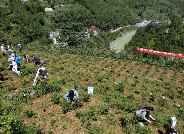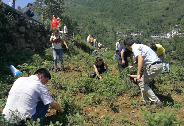 在村社干部的带领下,希尔安党员同志们步行翻山越岭,抵达大进镇明洪村中药材种植基地,二话不说便按事先部署走进田间地头,挽起袖子开始拔草。