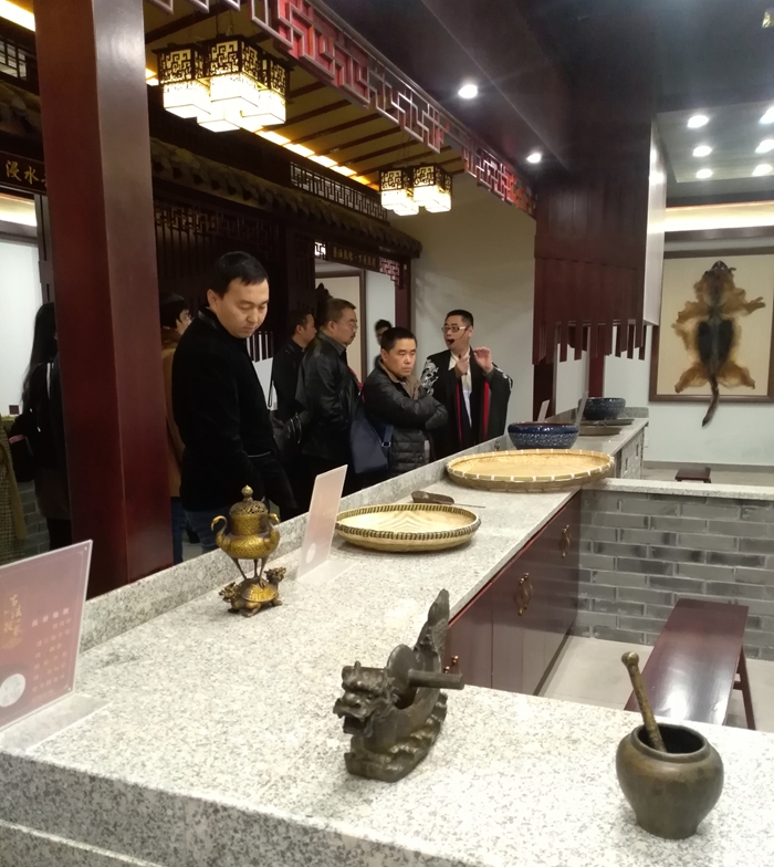 伴着绵绵细雨,上午十点左右,专家们来到希尔安药业合川厂区。专家们首先参观了公司新落成的伍舒芳药坊非物质文化遗产展示厅。企业文化部经理谭强身着独具特色的古代服饰,声情并茂地向来访嘉宾讲解了希尔安药业的悠久历史和伍舒芳传统膏药制作技艺的特殊流程。