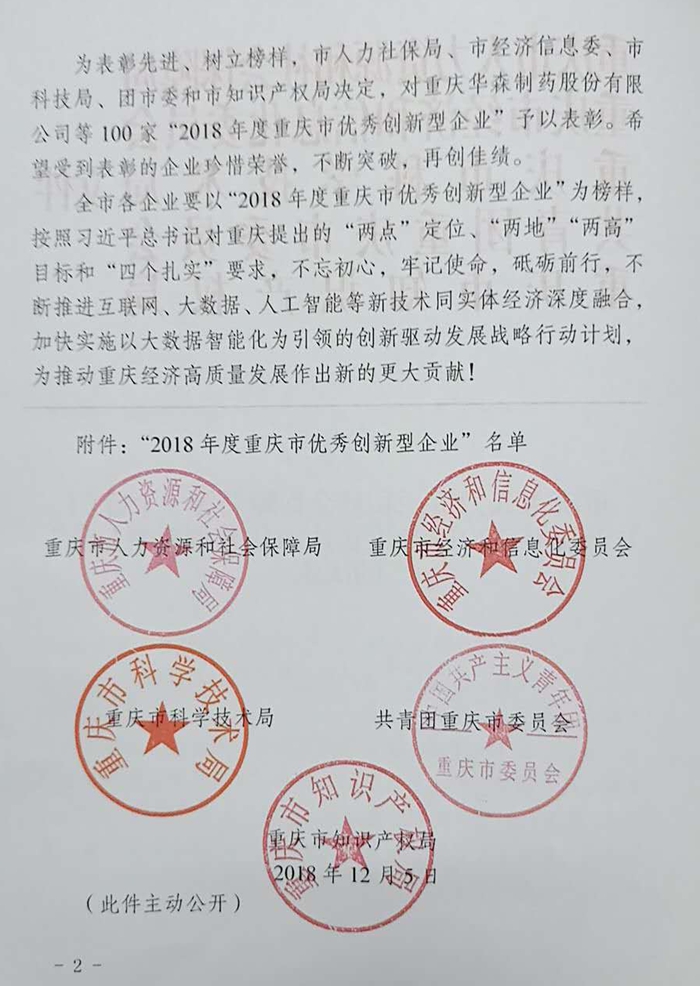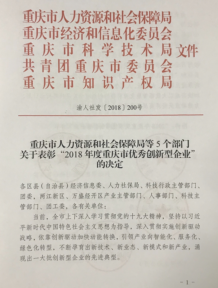 为深入贯彻党的十九大精神,加快实施以大数据智能化为引领的创新驱动发展战略,进一步营造创新创业的良好氛围,推动创新型企业加快发展,日前,重庆市人力社保局、市经济信息委、市科技局、团市委和市知识产权局等部门联合举行了“2018年重庆市创新型企业100强”评选。