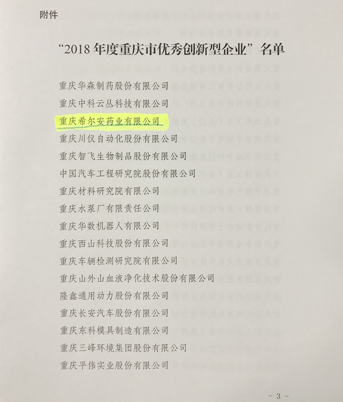智能制造,重庆在行动。12月21日,重庆市2018年智能制造推进大会在渝州宾馆召开。会上,包括重庆希尔安药业有限公司在内的100家企业被表彰为“2018年度重庆市优秀创新型企业”。