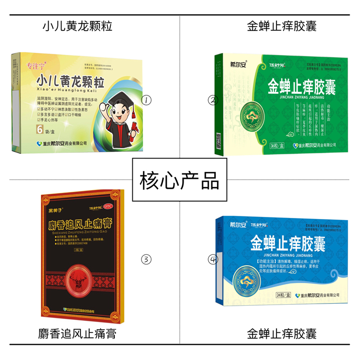 2018年,三大核心品种:小儿黄龙颗粒、麝香追风止痛膏、金蝉止痒胶囊进入国家新版基药目录