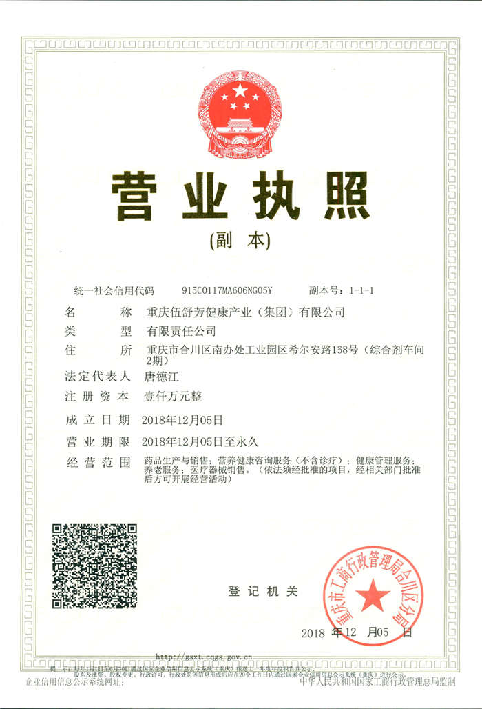 2018年12月5日,重庆市工商行政管理局合川区分局正式向重庆希尔安药业有限公司颁发了“重庆伍舒芳健康产业(集团)有限公司”营业执照,法定代表人为唐德江董事长,标志着重庆伍舒芳健康产业(集团)有限公司正式成立。