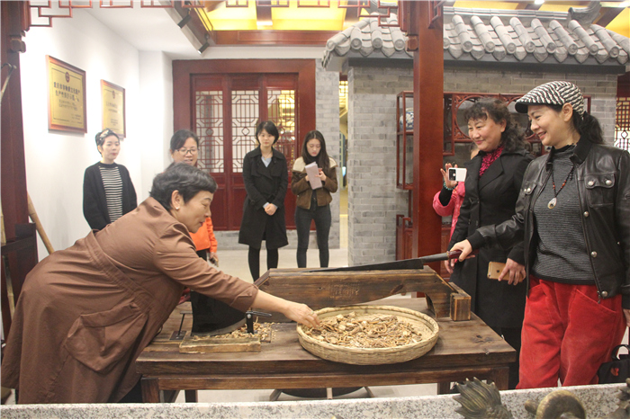 看到药碾、铡刀等炮制工具,何万兰等人兴奋地上前演示起当年在重庆中药总厂操作的动作