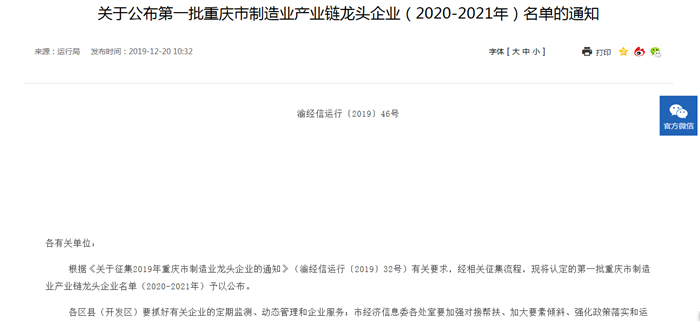 《关于公布第一批重庆市制造业产业链龙头企业(2020-2021年)名单的通知》要求,各区县(开发区)要抓好有关企业的定期监测、动态管理和企业服务;市经济信息委各处室要加强对接帮扶、加大要素倾斜、强化政策落实和运行调度,合力助推我市制造业产业链龙头企业做大做强做优。