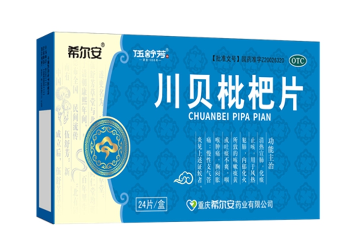 川贝枇杷片是的重庆伍舒芳健康产业集团(希尔安药业)的重点产品,主治清热宣肺,化痰止咳,用于风热犯肺,内郁化火所致的咳嗽痰黄或吐痰不爽,咽喉肿痛,胸闷胀痛,慢性支气管炎见上述证候者。是全国独家剂型,医保乙类,OTC乙类产品,产品不含糖,适合糖尿病患者使用。