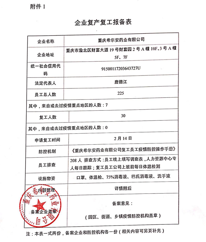 根据渝肺炎组办《关于切实做好新型冠状病毒感染的肺炎疫情防控期间企业复产复工有关工作的通知》和重庆两江新区管理委员会、重庆合川工业园区管理委员会的具体要求,集团完成复工相关文字材料50余页,准备口罩5000余个、红外体温计10余台、75%消毒酒精1000余公斤、84消毒液近50公斤,接受现场检查10余次。希尔安药业合川厂区经重庆市合川工业园区管委会审批同意,于2月10日分时段分班次逐步恢复生产经营;2月16日,重庆总部经重庆两江新区管理委员会审批同意于2月17日开始分批复工。