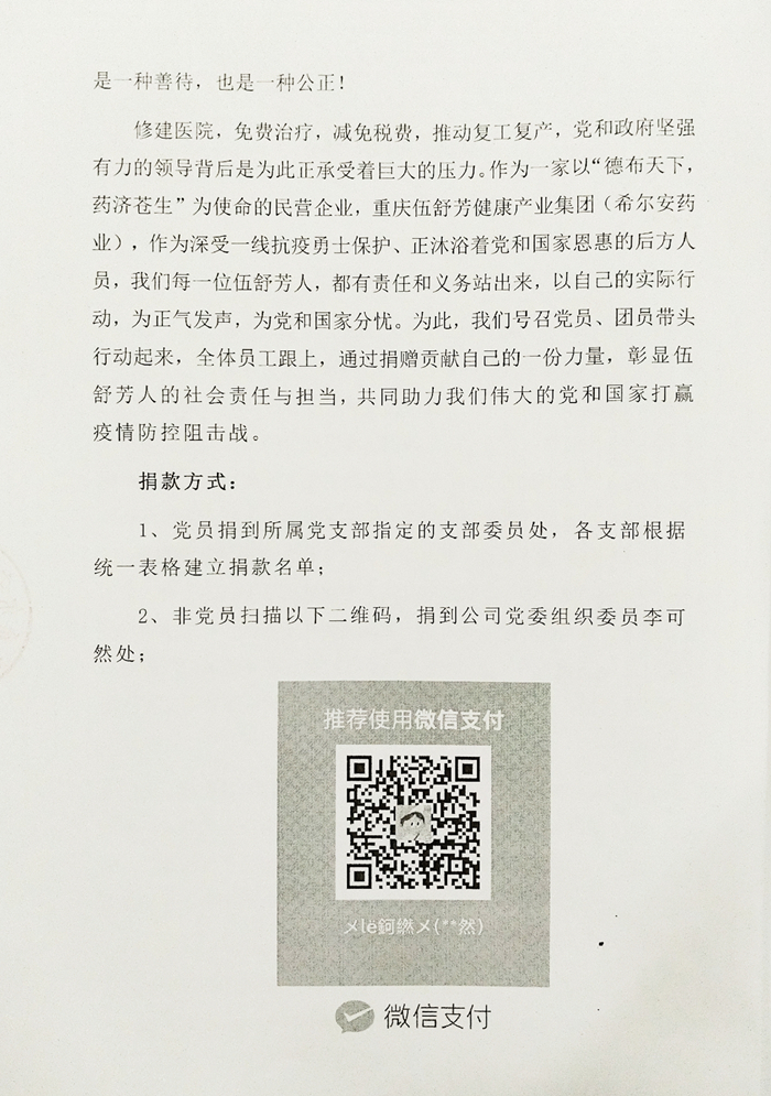 伍舒芳集团主流价值观认为,对于这些疫情面前毅然请战的英雄,他们可以不计报酬,无论生死,但社会公众却不能拿道德的高标去绑架他们:“为众人抱薪者,不可使其冻毙于风雪”;“一切口惠而实不至的颂扬都是在耍流氓”;每一个在前线为防疫默默奉献的工作人员,都理应得到实实在在的报酬与奖励,才能让正气得以弘扬!才能慰劳他们的超额付出,这是一种善待,也是一种公正!现在,为抗击商情、推动复工复产,党和政府承受着巨大的压力。作为一家以“德布天下,药济苍生”为使命的民营企业——重庆伍舒芳健康产业集团(希尔安药业),作为深受一线抗疫勇士保护、正沐浴着党和国家恩惠的后方人员,全体伍舒芳人,在党员的带头下站了出来,以自己的实际行动,为正气发声,为党和国家分忧,通过捐赠贡献自己的一份力量,彰显伍舒芳人的社会责任与担当,共同助力我们伟大的党和国家打赢疫情防控阻击战。