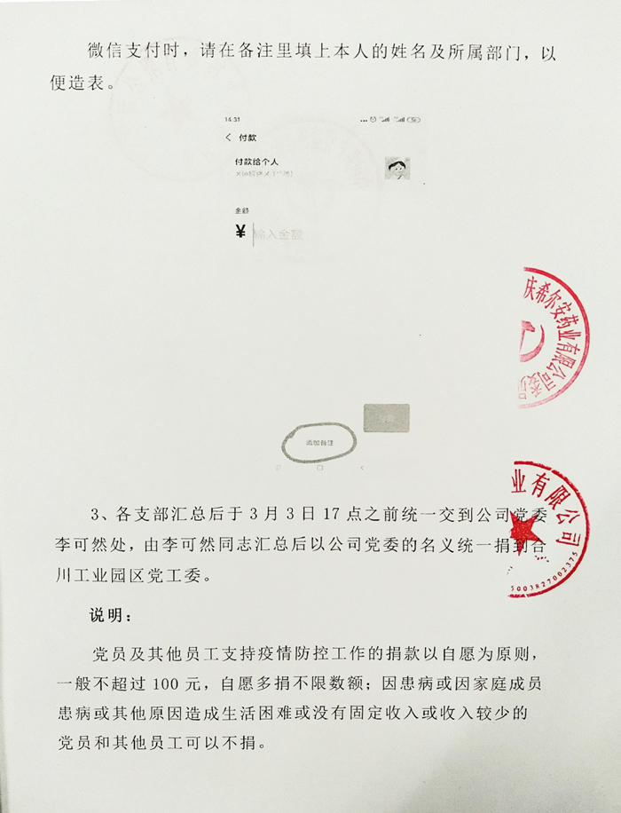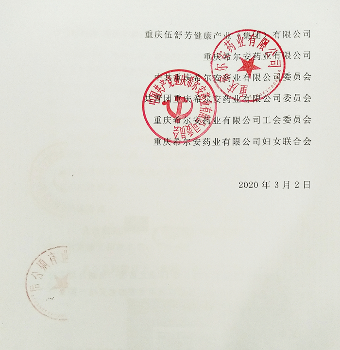 3月2日,重庆伍舒芳健康产业集团、重庆希尔安药业有限公司、中共重庆希尔安药业有限公司委员会、共青团重庆希尔安药业有限公司委员会、希尔安药业工会委员会、希尔安药业妇女联合会联合发出倡议,号召全体党员、入党积极分子、共青团员、工会会员、妇联成员等全体员工为一线抗疫人士捐款,以慰劳他们为抗击疫情做出的贡献,支援全国抗疫。倡议书一经发出,便在公司各个群里引发广泛的关注与讨论,全体员工云集响应,踊跃捐赠。截止3月5日10:50,集团合计收到捐款33338元,并将捐款明细在全集团进行了公示,所得捐款汇总后已统一上交给合川工业园区党工委,并顺着党组织这条线逐级上交到中组部。