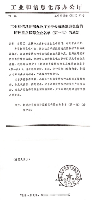 据悉,为贯彻落实党中央、国务院关于新冠肺炎疫情防控工作的决策部署,加大对疫情防控重点保障企业支持力度,切实做好疫情防控医疗物资保障,经地方工业和信息化主管部门以及中央企业推荐,国家工信部综合确定了《新冠肺炎疫情防控重点保障企业名单(第一批)。