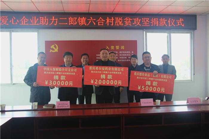 久雨初晴,阳光明媚。4月24日,由合川区农业农村委(扶贫办)、合川区工商联牵头组织,重庆希尔安药业有限公司携手重庆德佳食品公司、中国人保财险合川支公司,来到合川区二郎镇六合村开展公益捐赠活动,共计捐赠28万元,其中希尔安药业独家捐赠20万元,助力六合村脱贫攻坚工作。区农业农村委、区扶贫办主任李逢春,区工商联党组书记、常务副主席袁中东,二郎镇党委书记张光荣,镇长欧敏,六合村支部书记张军,希尔安药业人力资源总监何兴平,企业文化部经理谭强等参加捐赠仪式。