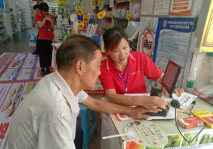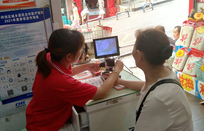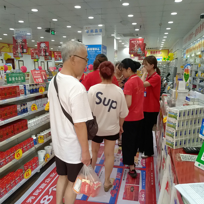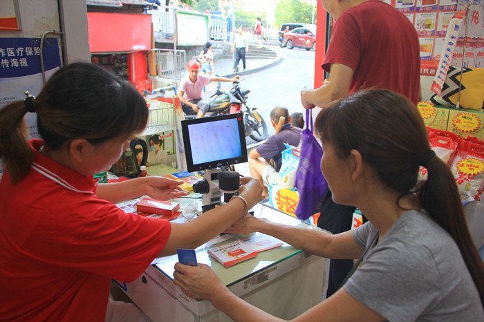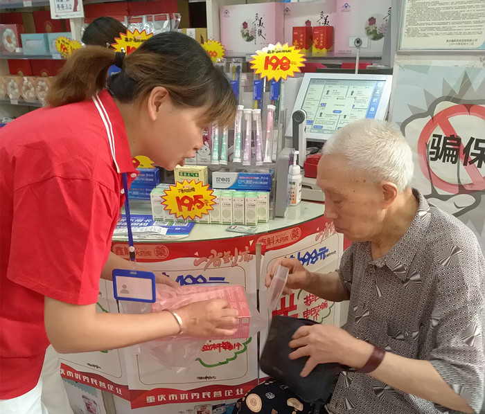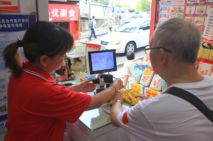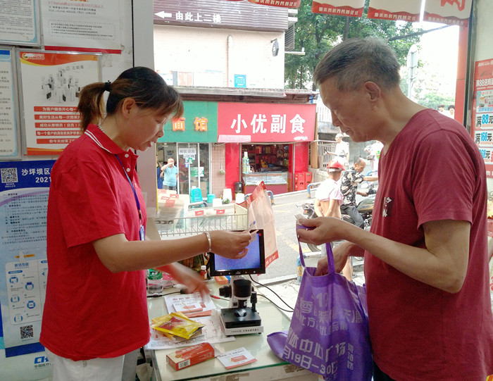 7月28日一大早,重庆沙坪坝杨公桥鑫斛药房,尽管高温暑热,但还是有很多忠实的顾客乘着清晨的短暂清凉走进店里选购药品。药店工作人员礼貌周到地陪伺左右,随时回答顾客的各种问题,帮助他们挑选适合自己的药品,门口最醒目的位置有一处工作台,好几位大爷大妈正围着驻店工作人员看热闹,不时叽叽喳喳地评论几句,轮流为自己做一项免费检测。