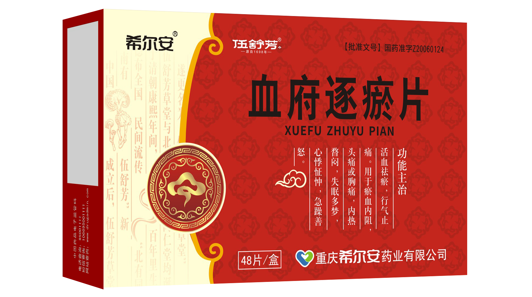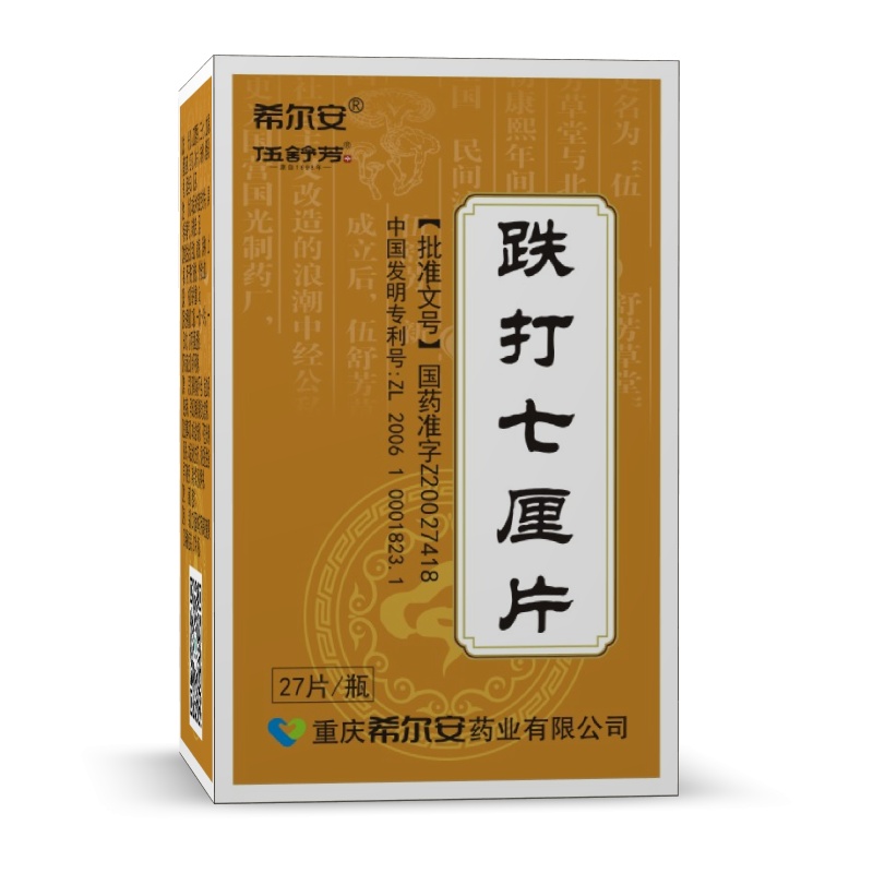 跌打七厘片,源于伍宏宪创制的伍氏七厘散,也是伍舒芳传世经典产品之一,是国家中药保护品种、全国独家发明专利产品,具有活血,散瘀,消肿,止痛的功效,用于跌打损伤、外伤出血。七厘散含血竭、麝香等贵细药材,据《良方集腋》载述:“此方传自军营,凡打仗受伤,屡有起死回生之功。而两粤云贵得此方,调治斗殴诸重伤,无不应手立痊……功效如铁扇散更为奇捷,诚急救之神方,济世之宝筏焉”。