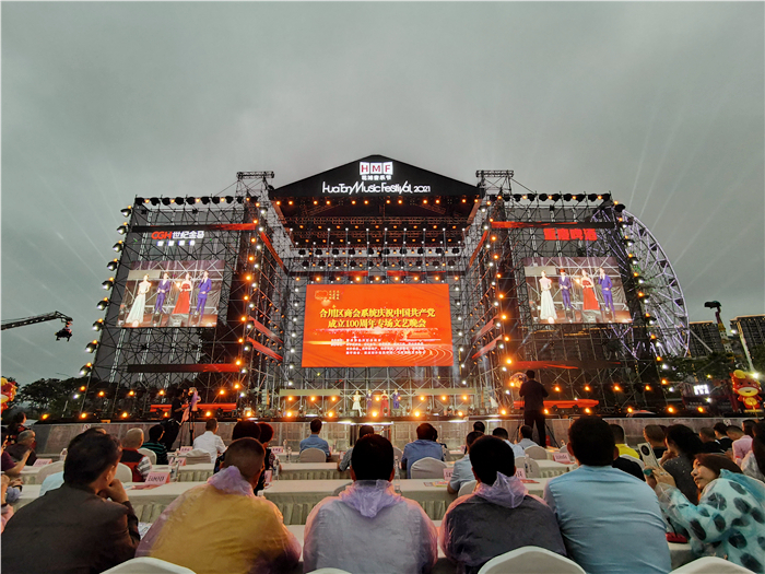 本场晚会以百年党史为大背景,紧扣“感恩党、听党话、跟党走”主题,通过百花齐放的文艺汇演节目感染现场所有人,引领所有人进一步学党史、悟思想、办实事、开新局,营造浓厚的拼搏奋斗氛围。本次晚会节目类型有歌唱、舞蹈、情景剧、杂技、戏曲等多种表演形式,晚会现场热闹纷呈,吸引了大量政企工作人员和市民慕名前往观看。希尔安药业原创歌舞节目《紧紧跟党走》更是直截了当点明整个晚会的主题,成为整场晚会的点睛之笔,压轴节目。虽然一场突如其来的大暴雨让现场观众被迫临时避雨,但舞台上演员们依然坚守岗位,坚持高质量完成了整台演出,而现场观众被演员们的敬业精神所感动,有的穿上雨衣、有的躲进活动现场四围的建筑或临时商棚,依然不离不弃,坚持看完了整个演出。不经历风雨,该怎么见彩虹?一场暴风骤雨反而成为对全场演出人员、工作人员和观众的心灵洗礼,更加燃起了大家一心跟党走、紧紧跟党走的心声。