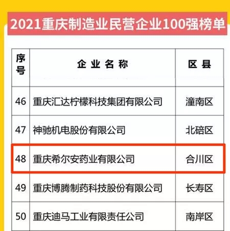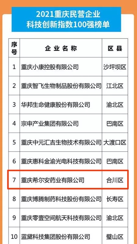 2021年10月9日,重庆市工商联发布了2021重庆民营企业百强榜单,希尔安药业凭借着强大的科技创新实力和综合实力,在激烈的竞争中脱颖而出,位居“2021重庆民营企业科技创新指数100强榜单”第7名、“2021重庆制造业民营企业100强榜单”第48名,双榜有名!