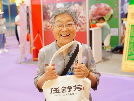 图为第七届中华老字号(山东)博览会现场,一位收到“伍舒芳健康大礼包”的老奶奶,脸上洋溢着灿烂的笑容,对拿在手里的礼包翻来覆去观看,爱不释手。