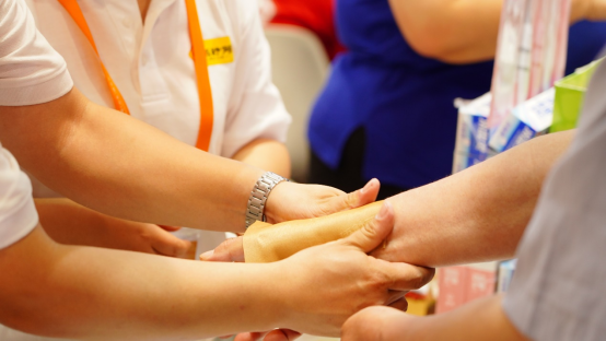图1-4为第七届中华老字号(山东)博览会现场,工作人员为普通观众试贴膏药。