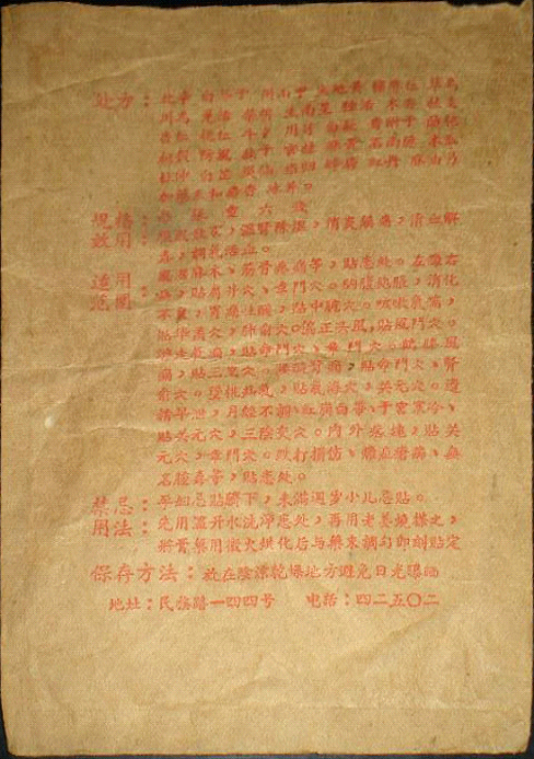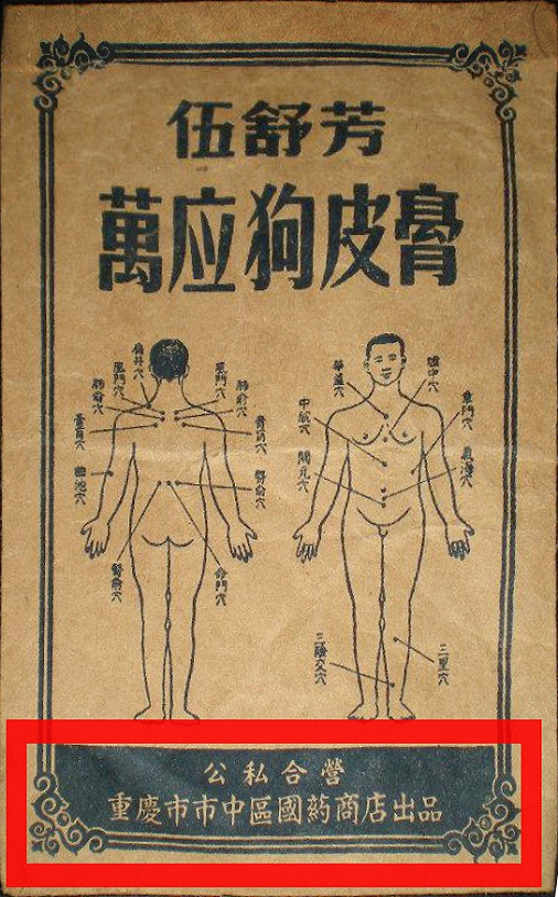 早在2013年我就从一个文物网站上查到了这两张图片,现在保存在一个私人收藏家手里。从图片内容上分析,这是伍舒芳万应狗皮膏外包装盒上的广告内容。正面显示万应狗皮膏为“公私合营重庆市市中区国药商店”出品。当时我们一度以为伍舒芳万应狗皮膏只是在这家国药商店销售过,或者说是由这家国药商店委托生产。所以这张图片我们前些年一直认为它只能证明伍舒芳万应狗皮膏的真实存在。