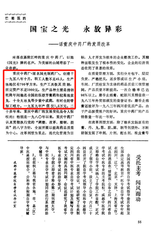由此,我们可以证实,伍舒芳于1956年完成社会主义改造,首先是公私合营改制为“公私合营重庆市市中区国药商店”,1958年全国掀起大办工业的热潮,国药商店又将其分设在民族路、两路口、解放路的三个中药加工作坊集中起来,组建成为“地方国营重庆市市中区国光制药厂”,并于1980年再次改制为重庆中药厂。