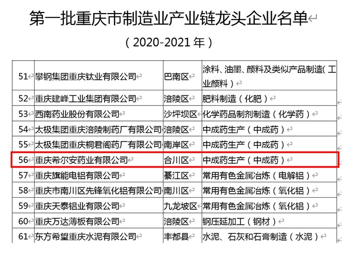 近日,希尔安药业成功入选第一批重庆市制造业产业链龙头企业(2020-2021年)名单,在所属中成药生产企业中,高居前三强。