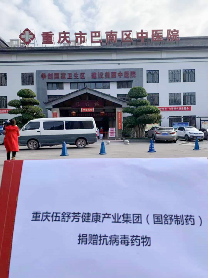 1月29日,伍舒芳健康产业集团旗下重庆国舒制药有限公司向巴南区捐赠价值12万多元的蒲公英颗粒、流感茶、大败毒洗液等抗病毒药物。