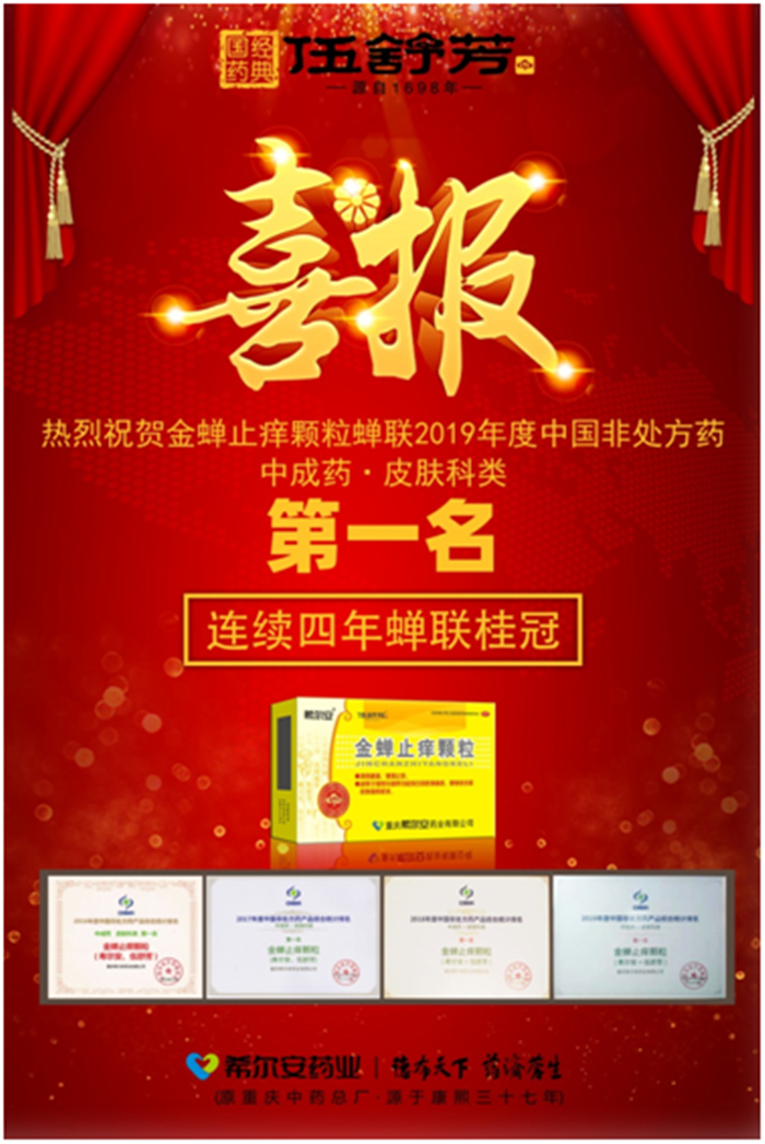 金蝉止痒颗粒在皮肤科类排名第一,连续四年蝉联桂冠。