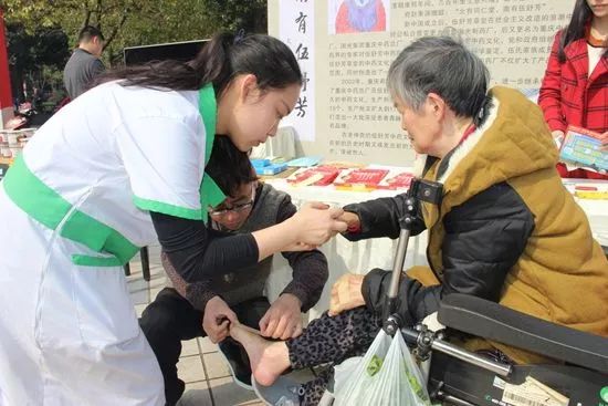 三个年轻人,蹲下身子,为一位坐在轮椅上的老奶奶脱下鞋子、袜子,在老人严重变形的脚趾上一一贴上膏药,再为老人穿好衣服、鞋袜,按摩疏通经络,像子女一样与老人唠唠家长里短,眼神中流露出..