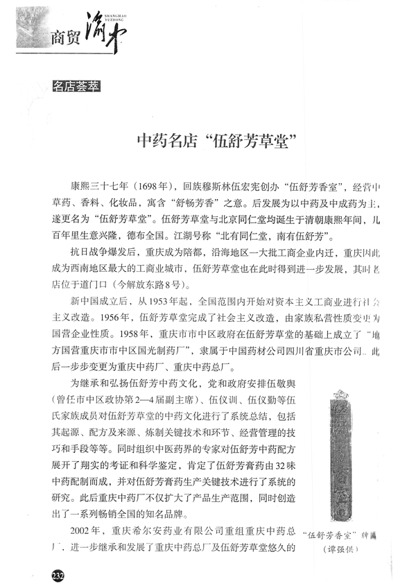 2016年,应重庆市渝中区政协文史馆邀请约稿,近日,我公司企业文化主管谭强执笔完成历史详稿《美名传天下——伍舒芳膏药》,并发送重庆市渝中区政协文史馆,随文配发大量伍舒芳历史档案图片和..