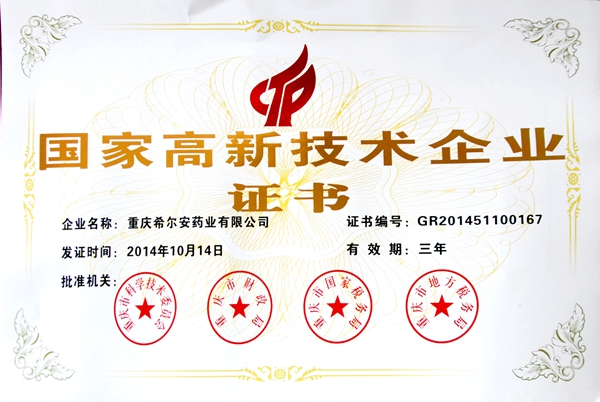 2015年,我司再次被重庆市科学技术委员会、重庆市财政局、重庆市国家税务局、重庆市地方税务局等四个部门授予“国家高新技术企业”荣誉称号,获颁牌匾及荣誉证书,证书编号:GR201451100167。..
