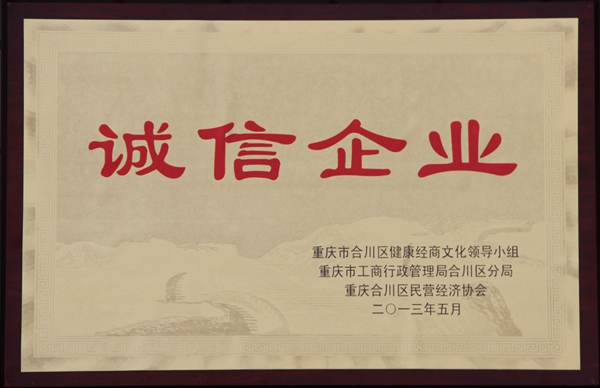 2013年5月31日,“合川区健康经商文化建设推进大会”在合川区文峰古街会江楼广场上召开。大会表彰了一批积极开展健康经商文化建设的工商企业和个体工商户,我司荣获“诚信企业”荣誉称号。区委..